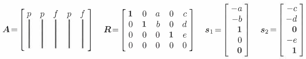 然后可以很方便地得出 $A\boldsymbol{x}=0$ 的可行解, 使一个 free column 为 1, 其余 free column 为 0 即可得到 1 个可行解, 然后对所有 free column 进行此过程即可得到所有可行解. 图解如下: