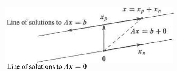 - Complete solution to $A \boldsymbol{x}=\boldsymbol{b}: \boldsymbol{x}=$ (one particular solution $\left.\boldsymbol{x}{p}\right)+\left(\right.$ any $\boldsymbol{x}{n}$ in the nullspace $) .$