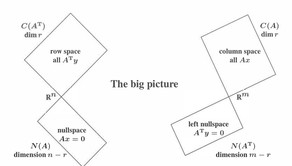 - The nullspace $\boldsymbol{N}(A)$ has dimension $n-r .$ The left nullspace $\boldsymbol{N}\left(A^{\mathrm{T}}\right)$ has dimension $m-r .$